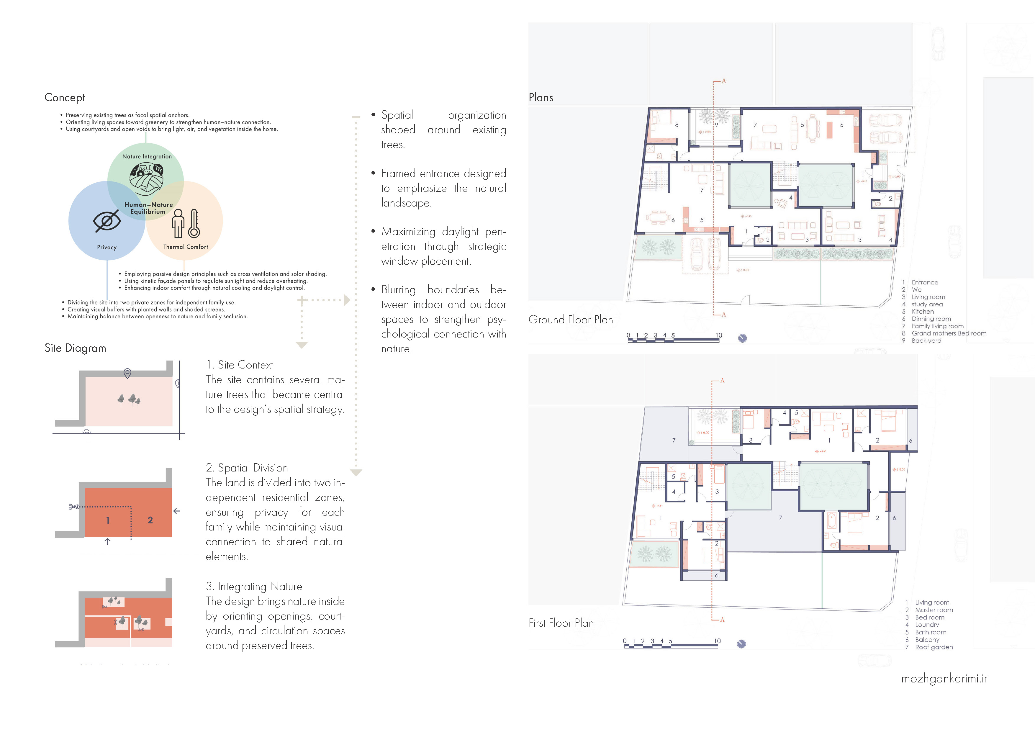 The design focuses on creating a dual-family villa that preserves existing trees on site, integrates passive climatic strategies, and promotes human–nature interaction through spatial organization.