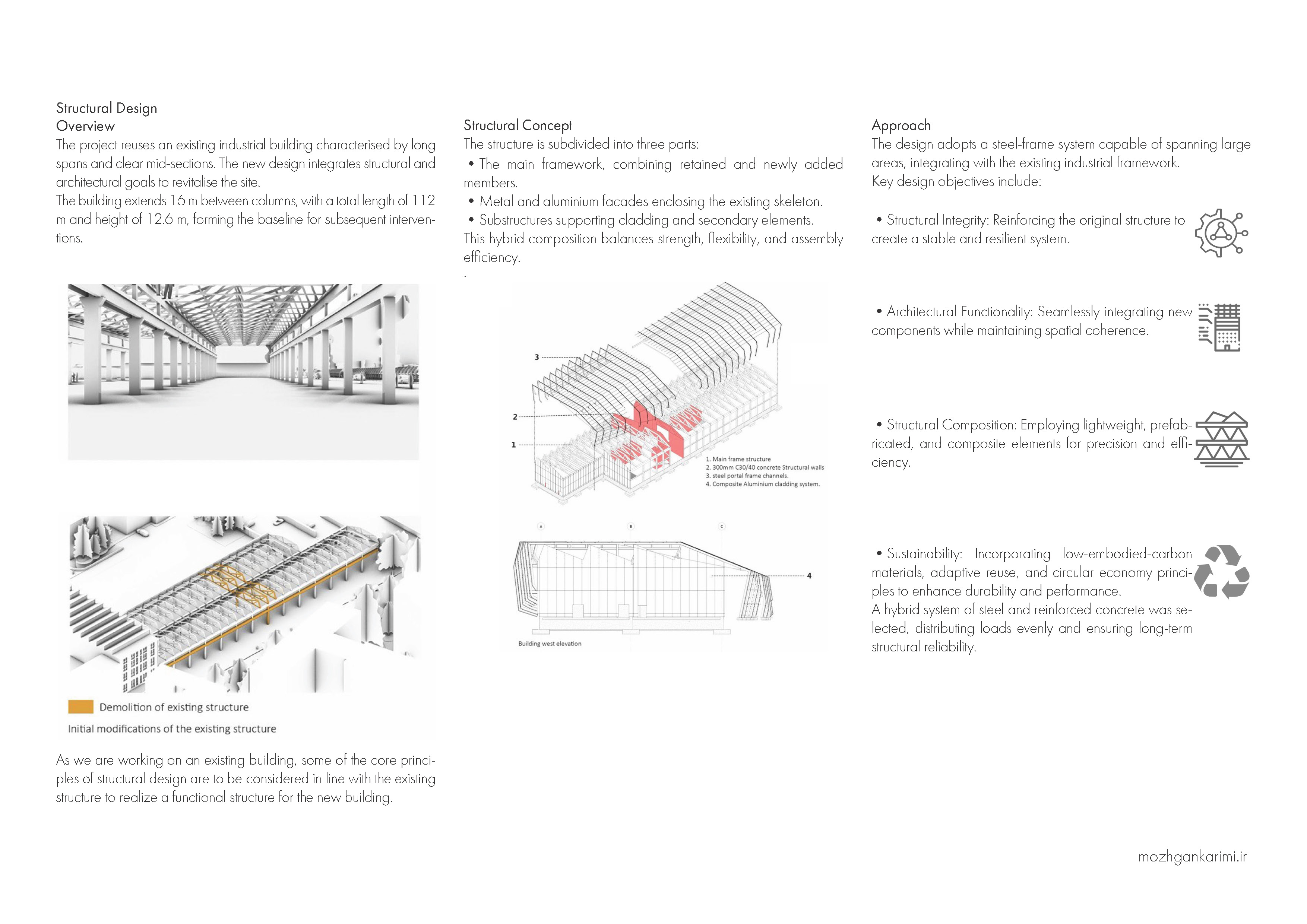 Guided by these contextual factors, the design vision aimed to transform the site into a multi-functional cultural and creative center, integrating public spaces to foster social interaction and cultural exchange. The project also emphasized sustainability, with strategies focused on reducing embodied carbon through careful material selection, adopting innovative energy-efficient technologies, and incorporating circular economy principles into the construction process.